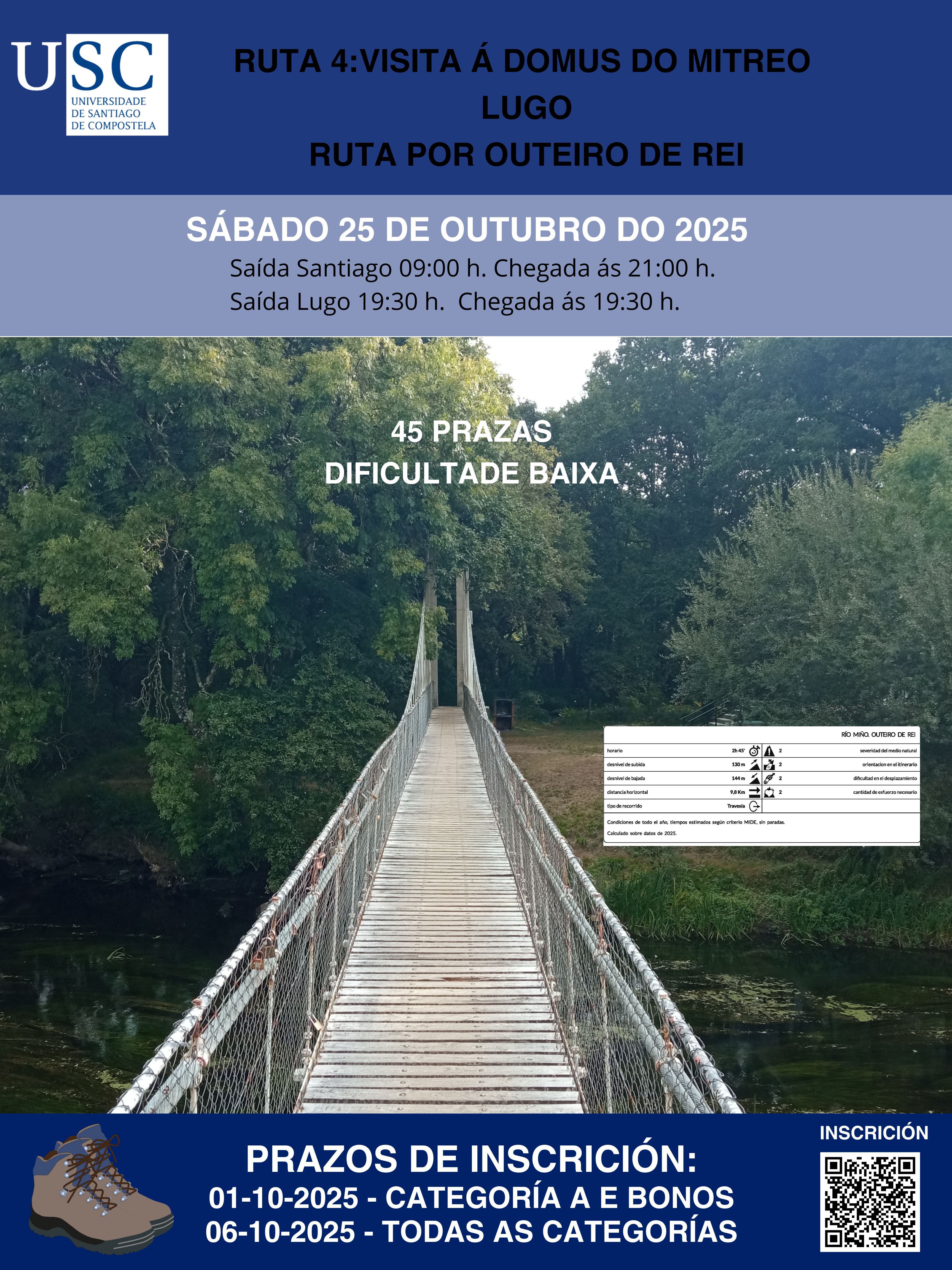 Código de dificultade: baixa, baixa-media, media, media-alta, alta. Profesorado: Víctor Fidalgo (Fundación USC). Créditos ECTS: 1 crédito por cada 6 rutas ou roteiros, cun mínimo de 4 rutas de 1 día e máximo de 2 roteiros, ver convocatoria. Notas: Consultar detalles sobre descontos, matrícula, e reserva de dereito a favor da USC, no publicado baixo o epígrafe «Información Xeral para Escolas e Actividades» e que tamén contén outra información de interese.